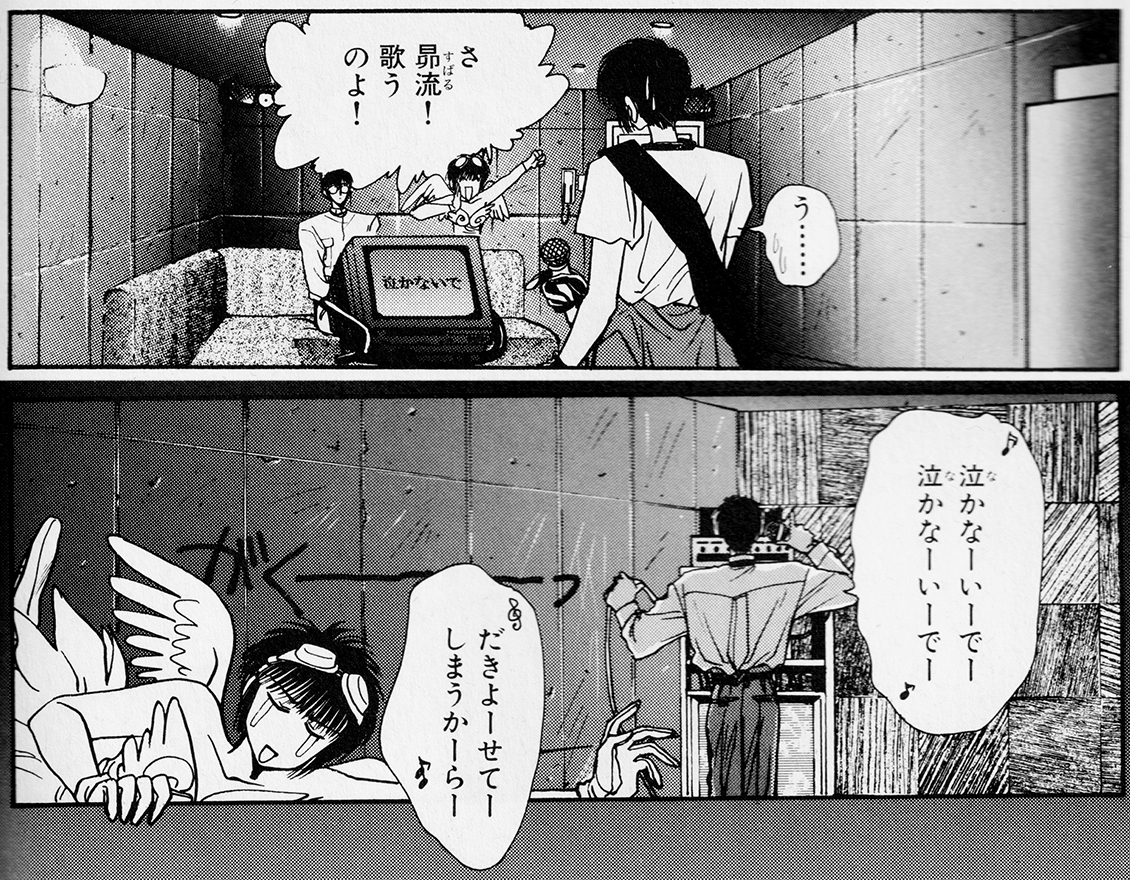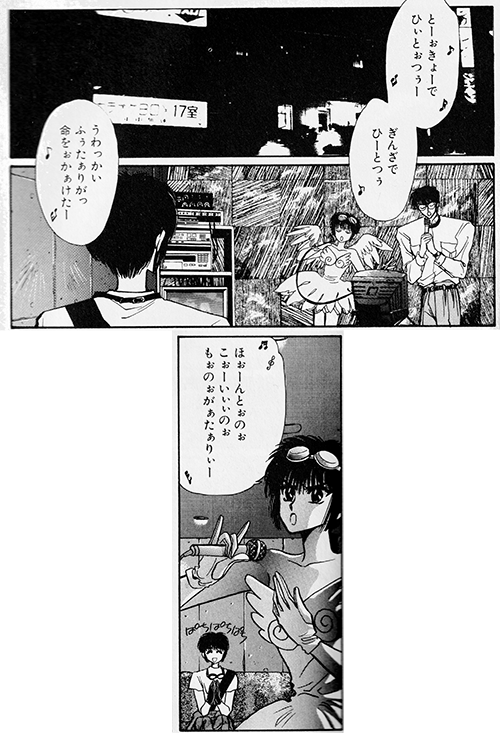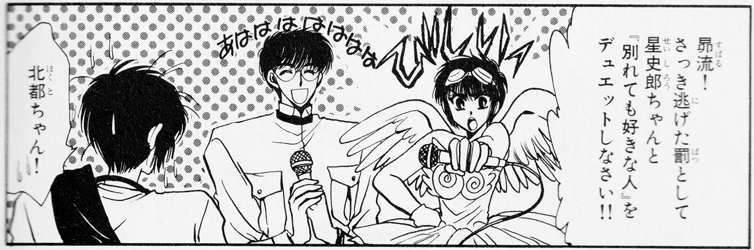 The song Hokuto is singing when Subaru attempts to sneak back into the karaoke box. Released in 1991, it peaked at #4 on the ORICON charts, and was remixed on Moritaka's second remix album as ザ・勉強の歌 (Za・Benkyo no Uta; "The・Study Song"). It was used as the opening theme to the anime TV series "Mischievous Twins: The Tales of St. Clare's". It's a totally gimmicky song (complete with voguing in the very weird video clip), though cheerful and catchy, so its popularity on the karaoke circuit at the time shouldn't surprise anyone. (You just know that Hokuto unironically adored this song, and drove Subaru batty by singing it at every opportunity.)